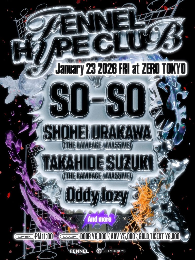 FENNEL初となる音楽イベントを、新宿・歌舞伎町のナイトエンターテインメントの発信地「ZEROTOKYO」にて開催いたします。 本イベントには「SO-SO」に加え、「浦川翔平」「鈴木昂秀」の2名が出演。さらに、追加アーティストの登場も予定しています。 深夜のZEROTOKYOで、ゲームカルチャーと音楽シーンがクロスオーバーする、かつてない熱狂をお届けします。